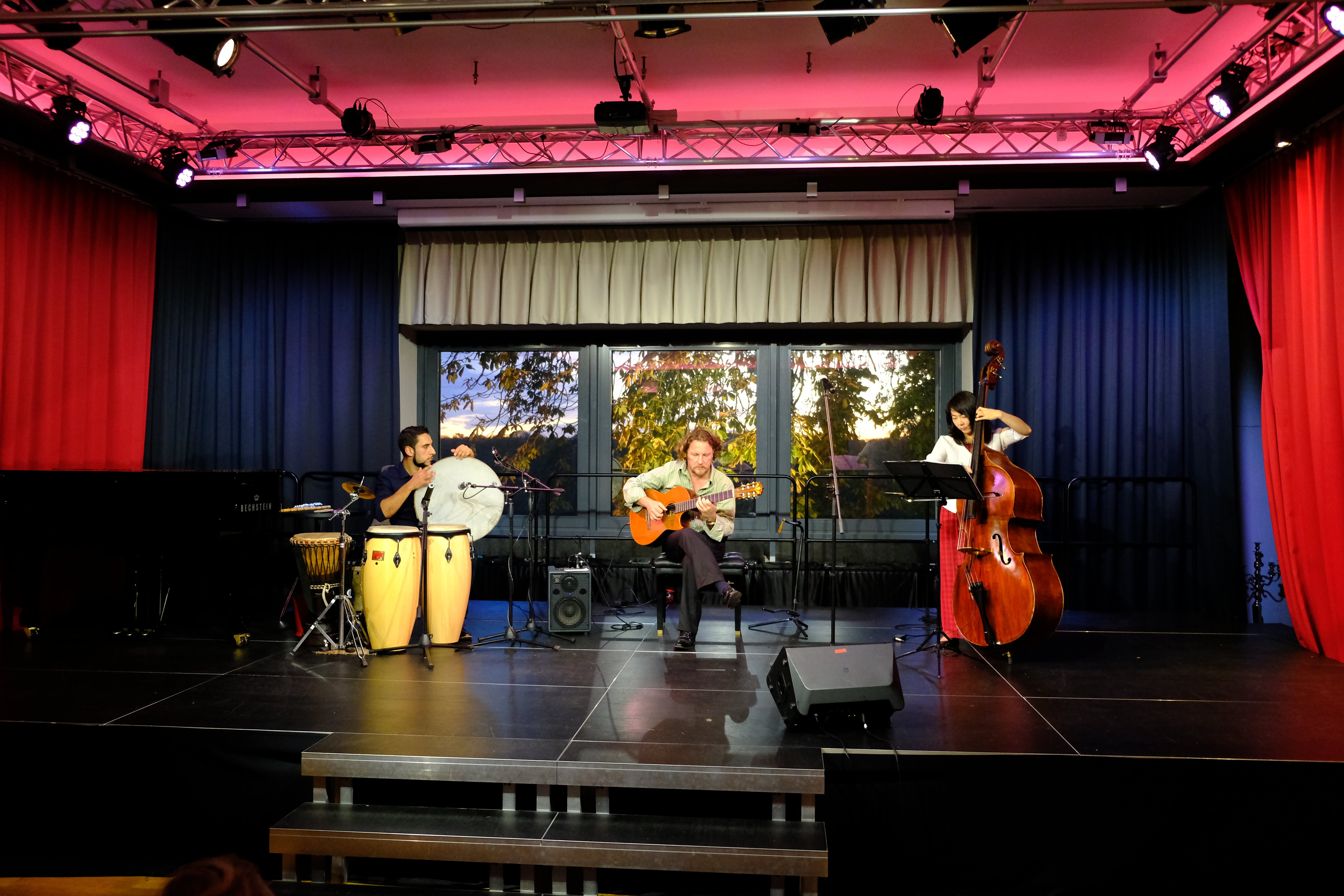 Ein einzigartiges Trio, das Jazz mit lateinamerikanischen Grooves, Klassik & Ausflügen in orientalische Gefilde kombiniert. Der Berliner Gitarrist, Flötist & Komponist Felix Komoll, der aus Palästina stammende Perkussionist Romeo Natur & die japanische Kontrabassistin Noriko Okamoto kennen sich aus verschiedenen musikalischen Projekten. Die vielseitige kreative Bandbreite der drei Ausnahmemusiker verbindet verschiedene musikalische Einflüsse mit subtilen Kompositionen aus eigener Feder.